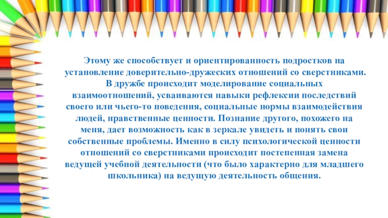 Слайд 6Этому же способствует и ориентированность подростков на установление доверительно-дружеских отношений со