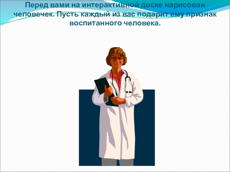 Перед вами на интерактивной доске нарисован человечек. Пусть каждый из вас подарит ему признак воспитанного человека.