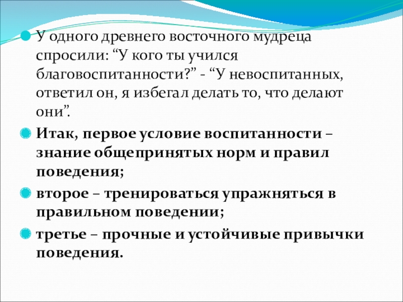 Слайд 12У одного древнего восточного мудреца спросили: “У кого ты учился благовоспитанности?”