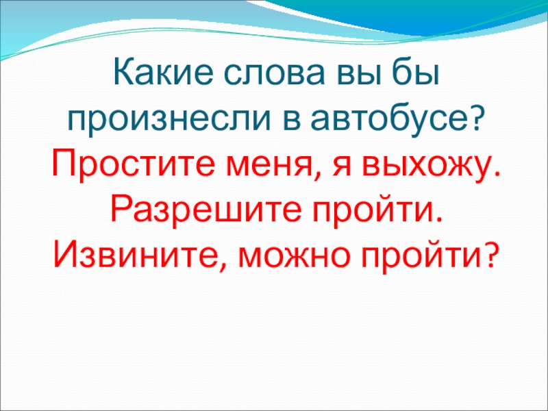 Слайд 4Какие слова вы бы произнесли в автобусе? Простите меня, я выхожу. Разрешите пройти. Извините,