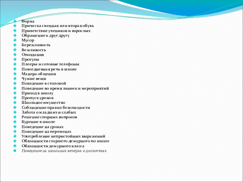Форма Прическа сменная или вторая обувь Приветствие учеников и взрослых Обращение к друг другу Мусор Бережливость Вежливость