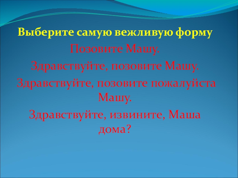 Выберите самую вежливую формуПозовите Машу.Здравствуйте, позовите Машу.Здравствуйте, позовите пожалуйста Машу.Здравствуйте, извините, Маша дома?