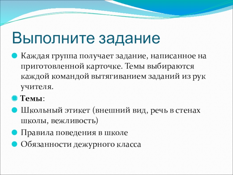 Каждая группа получает задание, написанное на приготовленной карточке. Темы выбираются
