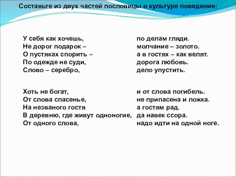 Слайд 8Составьте из двух частей пословицы о культуре поведения: