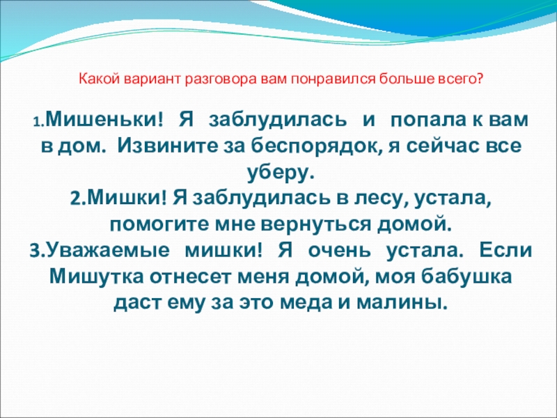 Какой вариант разговора вам понравился больше всего?   1.Мишеньки!   Я   заблудилась   и   попала к вам в дом.