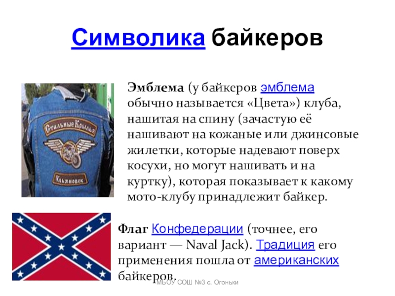 Эмблема (у байкеров эмблема обычно называется «Цвета») клуба, нашитая на спину (зачастую её нашивают на кожаные или джинсовые жилетки, которые надевают поверх косухи, но могут нашивать и на куртку), которая показывает к какому мото-клубу принадлежит байкер.