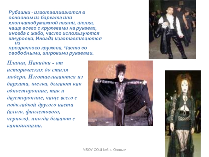 Плащи, Накидки - от исторических до стиля модерн. Изготавливаются из бархата, шелка, бывают как односторонние, так и двусторонние, чаще всего с подкладкой другого цвета (алого, фиолетового, черного), иногда бывают с капюшонами.