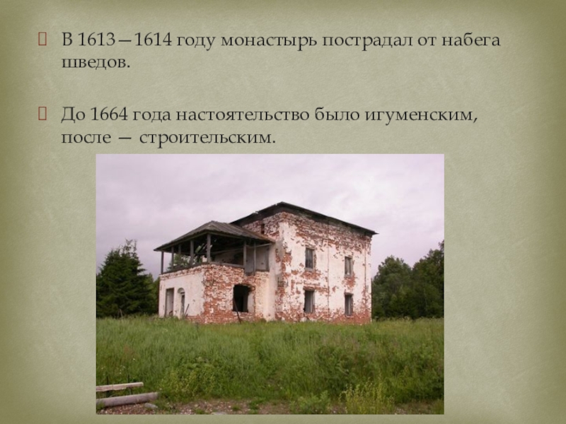 Слайд 3В 1613—1614 году монастырь пострадал от набега шведов.