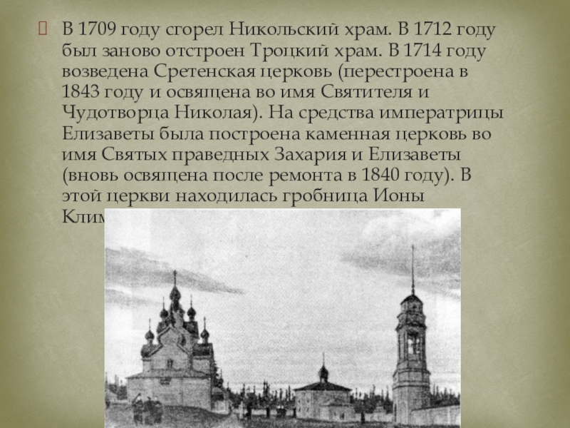 Слайд 4В 1709 году сгорел Никольский храм. В 1712 году был заново