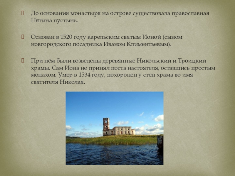 Слайд 2До основания монастыря на острове существовала православная Нятина пустынь.