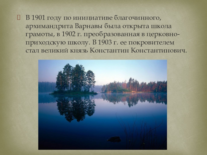 Слайд 9В 1901 году по инициативе благочинного, архимандрита Варнавы была открыта школа грамоты,