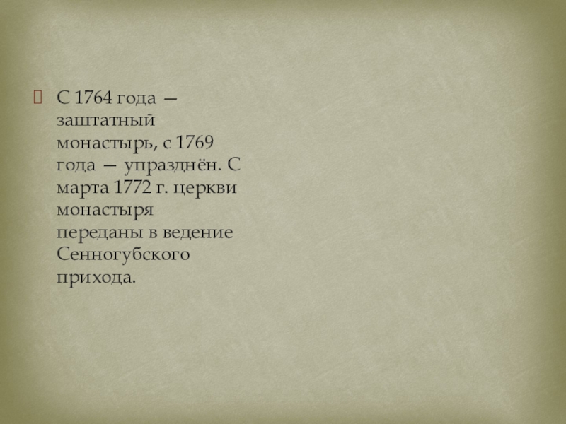 Слайд 5С 1764 года — заштатный монастырь, с 1769 года — упразднён.