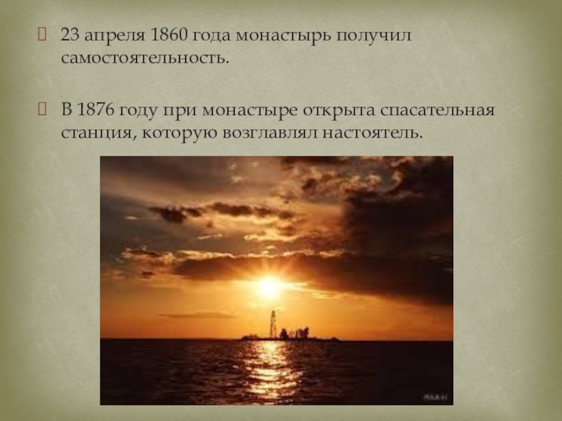 23 апреля 1860 года монастырь получил самостоятельность.В 1876 году при монастыре открыта спасательная станция, которую возглавлял настоятель.