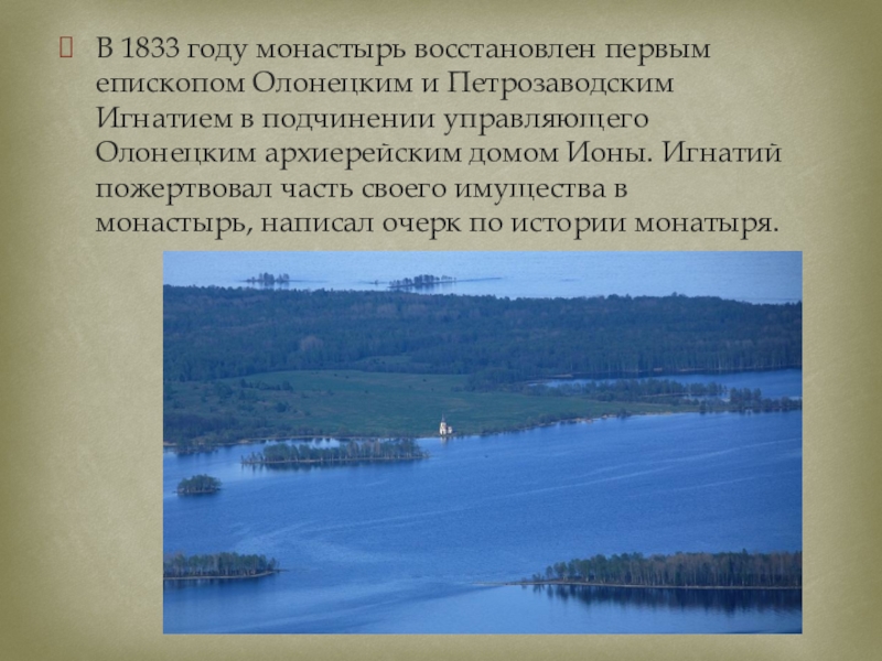 Слайд 6В 1833 году монастырь восстановлен первым епископом Олонецким и Петрозаводским Игнатием