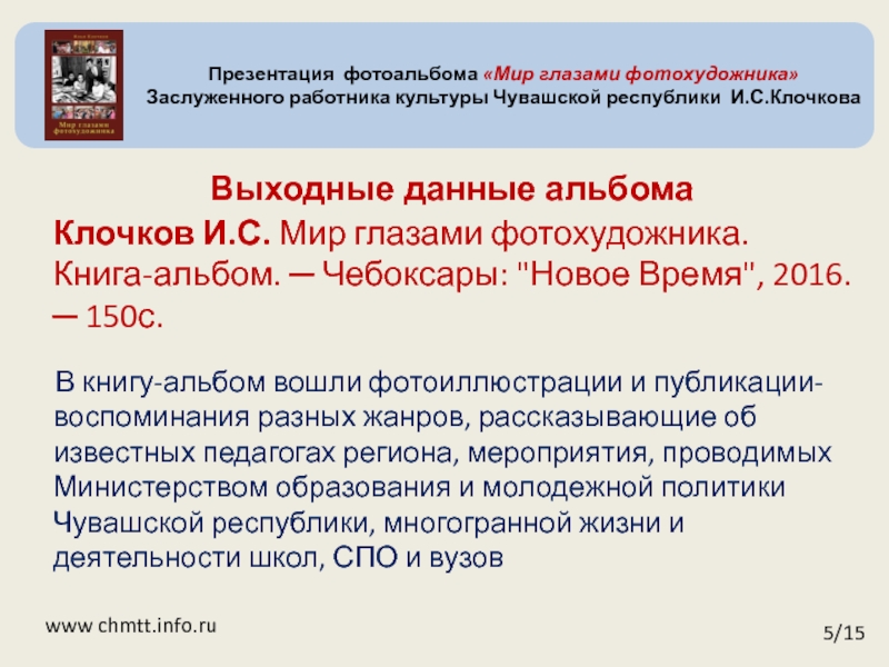 Клочков И.С. Мир глазами фотохудожника. Книга-альбом. ─ Чебоксары: "Новое Время", 2016. ─ 150с.