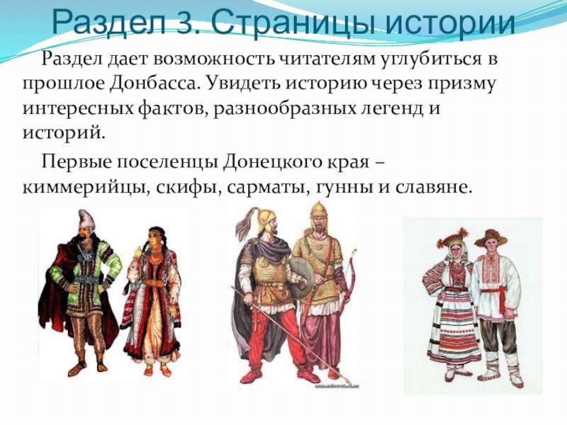 Первые поселенцы Донецкого края – киммерийцы, скифы, сарматы, гунны и славяне.