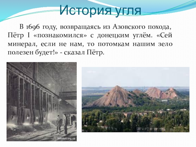В 1696 году, возвращаясь из Азовского похода, Пётр I «познакомился» с донецким углём. «Сей минерал, если не нам, то потомкам нашим зело полезен будет!» - сказал Пётр.