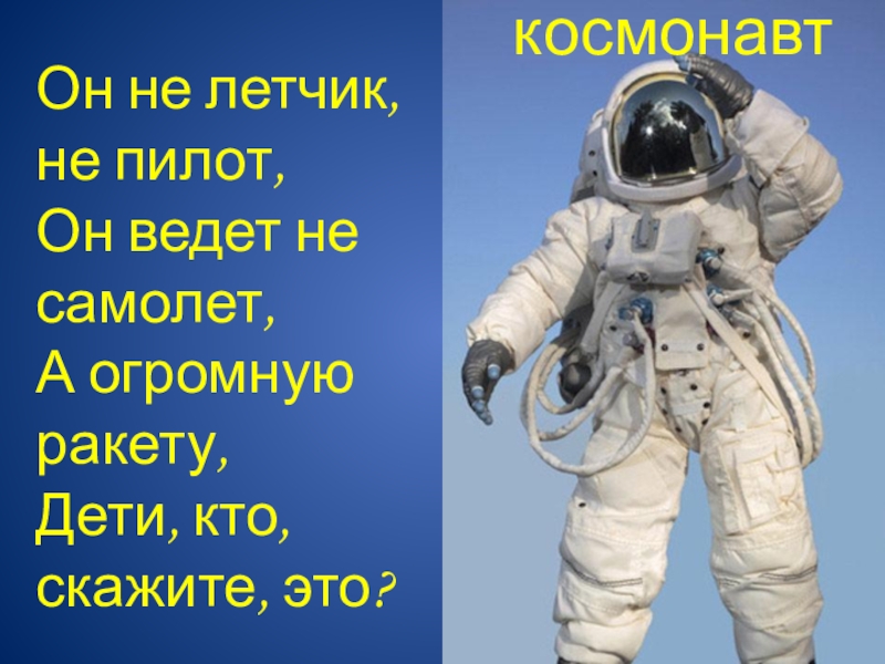 Он не летчик, не пилот,Он ведет не самолет,А огромную ракету,Дети, кто, скажите, это?космонавт