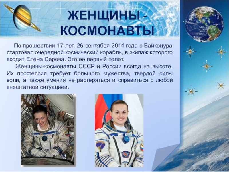 Женщины-космонавты СССР и России всегда на высоте. Их профессия требует большого мужества, твердой силы воли, а также умения не растеряться и справиться с любой внештатной ситуацией.