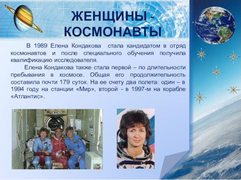 Елена Кондакова также стала первой – по длительности пребывания в космосе. Общая его продолжительность составила почти 179 суток. На ее счету два полета: один – в 1994 году на станции «Мир», второй - в 1997-м на корабле «Атлантис».