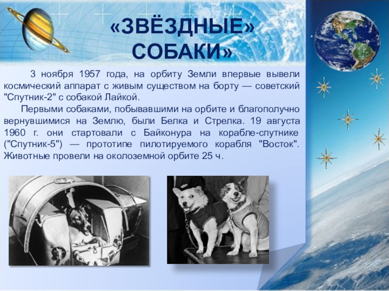 Первыми собаками, побывавшими на орбите и благополучно вернувшимися на Землю, были Белка и Стрелка. 19 августа 1960 г. они стартовали с Байконура на корабле-спутнике ("Спутник-5") — прототипе пилотируемого корабля "Восток". Животные провели на околоземной орбите 25 ч.