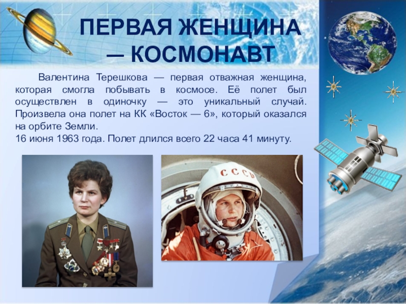 В.Терешкова: http://fb.ru/article/203358/pervyie-lyudi-v-kosmose-vyihod-pervogo-cheloveka-v-kosmos