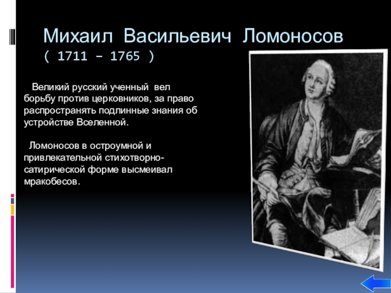Ломоносов в остроумной и привлекательной стихотворно-сатирической форме высмеивал мракобесов.