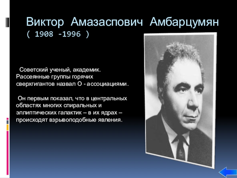 Виктор Амазаспович Амбарцумян ( 1908 -1996 ) Советский ученый, академик. Рассеянные группы горячих сверхгигантов назвал О -