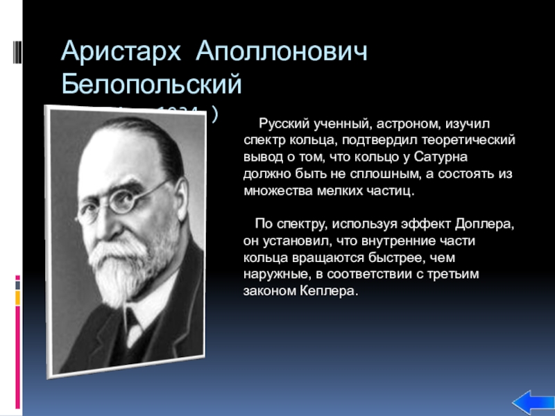 Аристарх Аполлонович Белопольский ( 1854 – 1934 )  Русский ученный, астроном, изучил спектр кольца, подтвердил теоретический