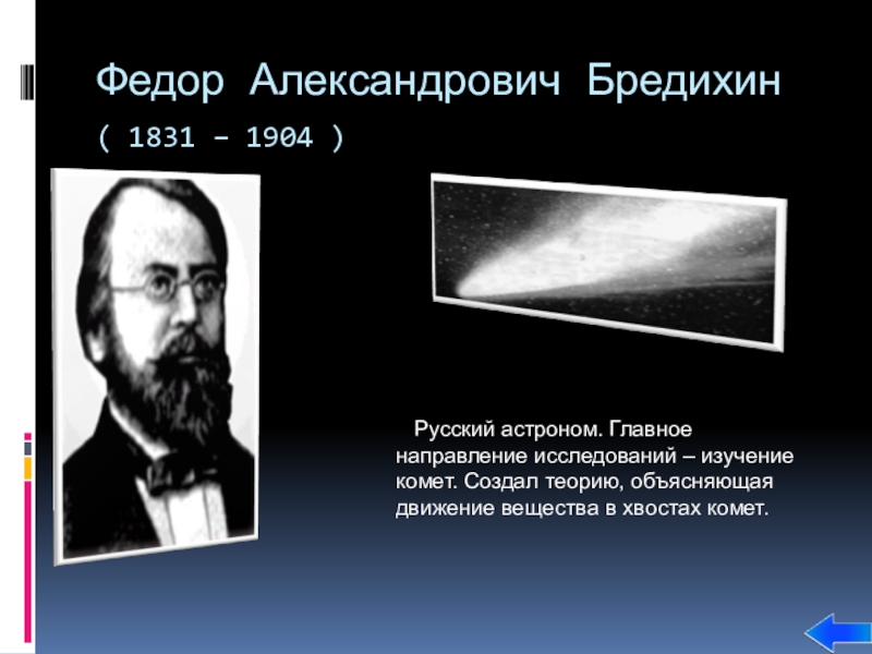 Федор Александрович Бредихин ( 1831 – 1904 )  Русский астроном. Главное направление исследований – изучение комет.
