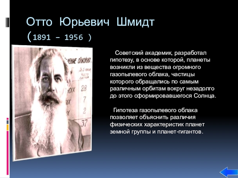 Отто Юрьевич Шмидт (1891 – 1956 )  Советский академик, разработал гипотезу, в основе которой, планеты возникли