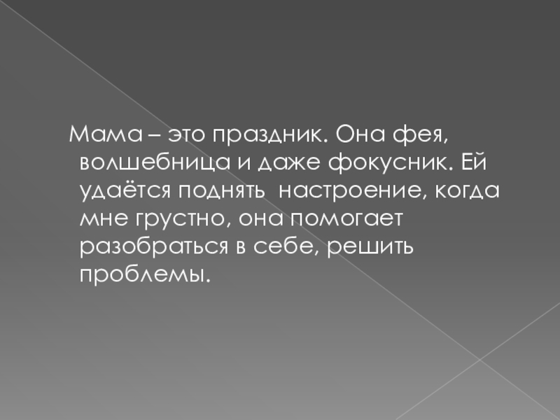 Мама – это праздник. Она фея, волшебница и даже фокусник. Ей удаётся поднять настроение, когда мне грустно, она помогает разобраться в себе, решить проблемы.