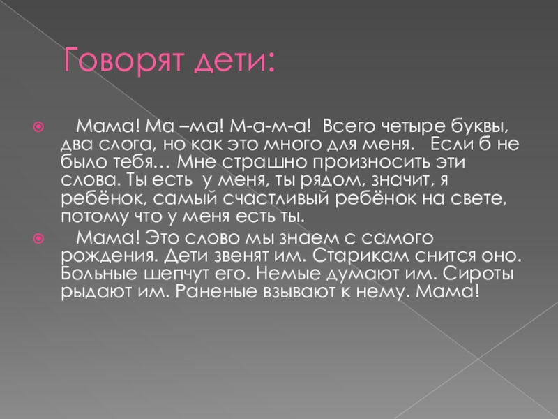 Мама! Это слово мы знаем с самого рождения. Дети звенят им. Старикам снится оно. Больные шепчут его. Немые думают им. Сироты рыдают им. Раненые взывают к нему. Мама!