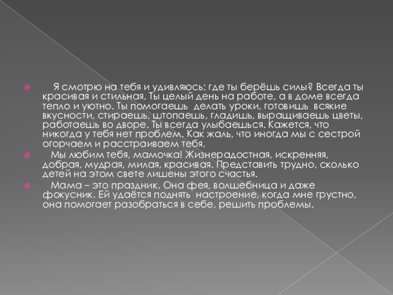 Всегда ты красивая и стильная. Ты целый день на работе, а в доме всегда тепло и уютно. Ты помогаешь делать уроки, готовишь всякие вкусности, стираешь, штопаешь, гладишь, выращиваешь цветы, работаешь во дворе. Ты всегда улыбаешься. Кажется, что никогда у тебя нет проблем. Как жаль, что иногда мы с сестрой огорчаем и расстраиваем тебя.
