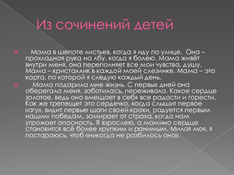 Мама подарила мне жизнь. С первых дней она оберегала меня, заботилась, переживала. Какое сердце золотое, ведь оно вмещает в себя все радости и горести. Как же трепещет это сердечко, когда слышит первое «агу», видит первые шаги своей крохи, радуется первым нашим победам, замирает от страха, когда нам угрожает опасность. Я взрослею, а мамино сердце становится всё более хрупким и ранимым. Милая моя, я постараюсь, чтоб «никогда не разбилось оно».