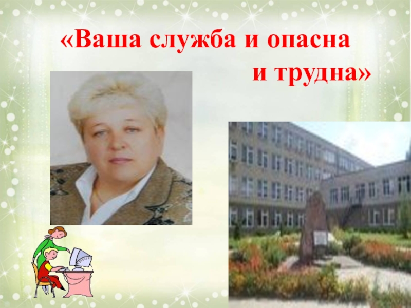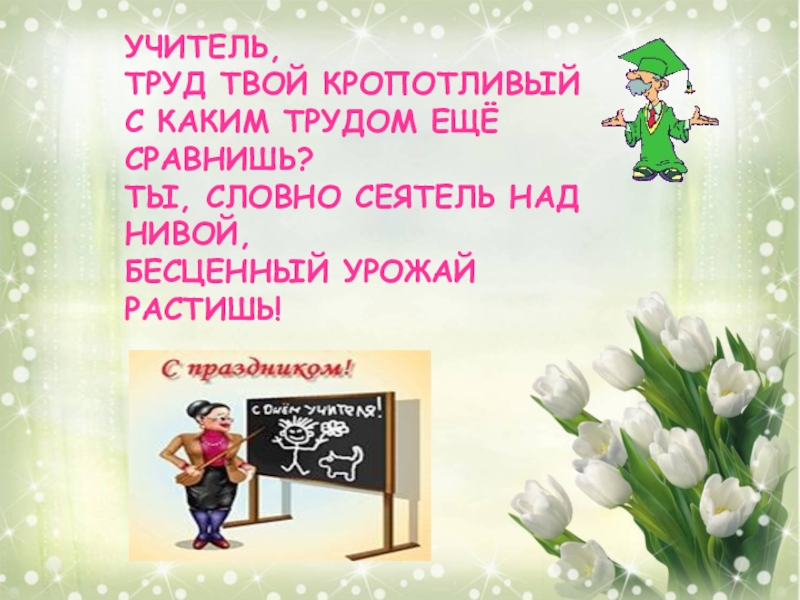 УЧИТЕЛЬ, ТРУД ТВОЙ КРОПОТЛИВЫЙ С КАКИМ ТРУДОМ ЕЩЁ СРАВНИШЬ? ТЫ, СЛОВНО СЕЯТЕЛЬ НАД НИВОЙ, БЕСЦЕННЫЙ УРОЖАЙ РАСТИШЬ!