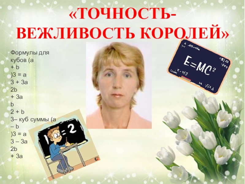 «ТОЧНОСТЬ-ВЕЖЛИВОСТЬ КОРОЛЕЙ»Формулы для кубов (a + b )3 = a 3 + 3a 2b + 3a b