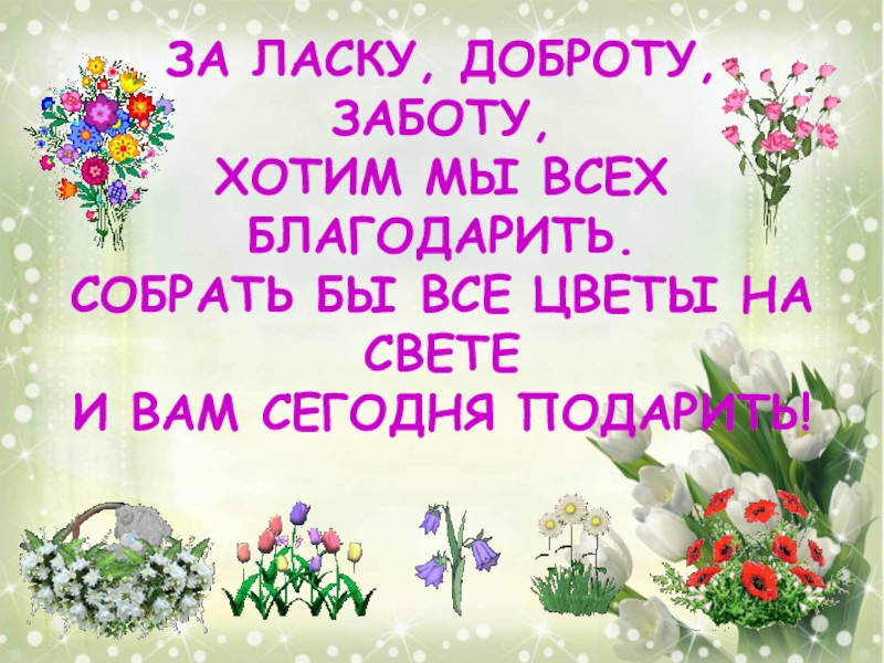 ЗА ЛАСКУ, ДОБРОТУ, ЗАБОТУ, ХОТИМ МЫ ВСЕХ БЛАГОДАРИТЬ.  СОБРАТЬ БЫ ВСЕ ЦВЕТЫ НА СВЕТЕ  И