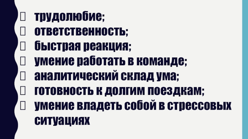 трудолюбие;ответственность;быстрая реакция;умение работать в команде;аналитический склад ума;готовность к долгим поездкам;умение владеть собой в стрессовых ситуациях