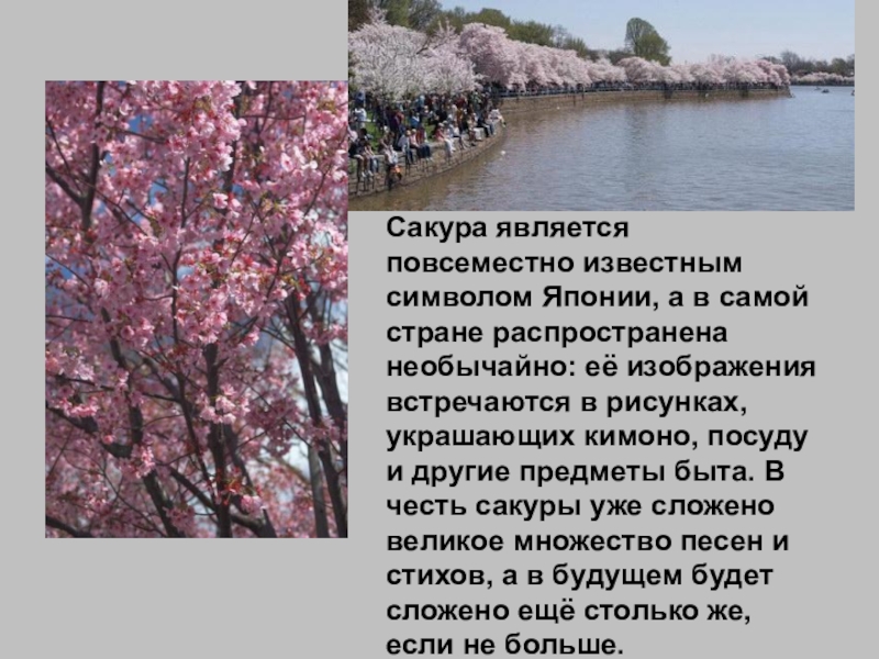 Слайд 7Сакура является повсеместно известным символом Японии, а в самой стране распространена