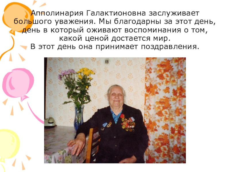 Задача: Оказать моральную поддержку Ветерану Великой Отечественной Войны Одношевиной Апполинарии Галактионовны.