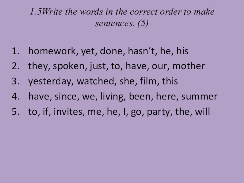 Слайд 81.5Write the words in the correct order to make sentences. (5)