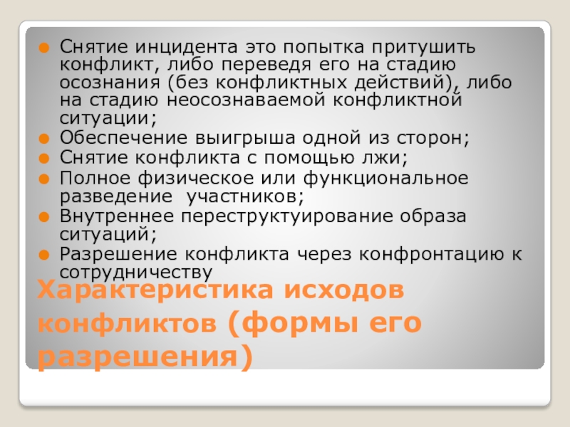 Характеристика исходов конфликтов (формы его разрешения)Снятие инцидента это попытка притушить конфликт, либо переведя его на стадию осознания