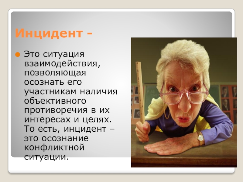 Инцидент -Это ситуация взаимодействия, позволяющая осознать его участникам наличия объективного противоречия в их интересах и целях. То