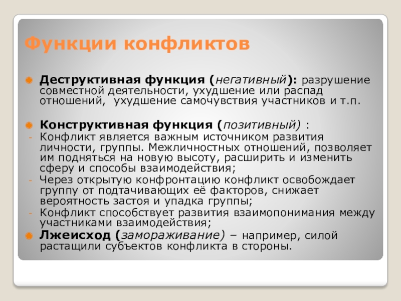 Функции конфликтовДеструктивная функция (негативный): разрушение совместной деятельности, ухудшение или распад отношений, ухудшение самочувствия участников и т.п.Конструктивная функция