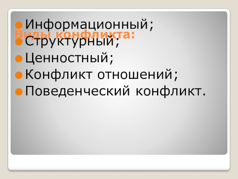 Виды конфликта:Информационный;Структурный;Ценностный;Конфликт отношений;Поведенческий конфликт.