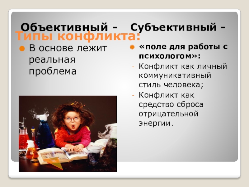 Типы конфликта:Объективный - Субъективный -В основе лежит реальная проблема«поле для работы с психологом»:Конфликт как личный коммуникативный стиль