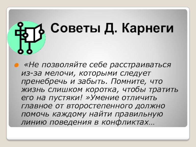Советы Д. Карнеги  «Не позволяйте себе расстраиваться из-за мелочи, которыми следует пренебречь и забыть. Помните,