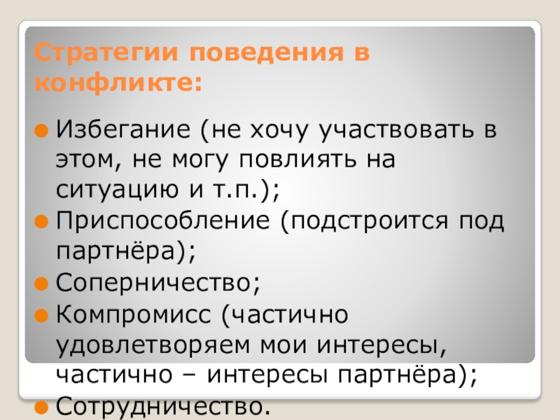 Стратегии поведения в конфликте:Избегание (не хочу участвовать в этом, не могу повлиять на ситуацию и т.п.);Приспособление (подстроится