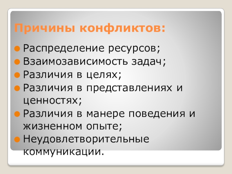 Причины конфликтов:Распределение ресурсов;Взаимозависимость задач;Различия в целях;Различия в представлениях и ценностях;Различия в манере поведения и жизненном опыте;Неудовлетворительные коммуникации.